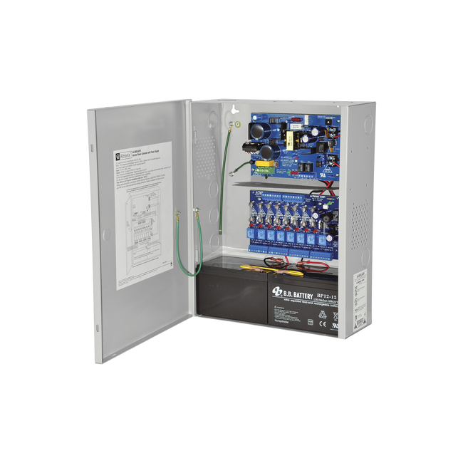 Fuente para aplicaciones en control de acceso, con capacidad de respaldo para 12 y 24 Vcc @ 4 A , con 8 circuitos de control ( NO ) y 8 circuitos de control trigger voltaje de entrada de : 115 Vca.