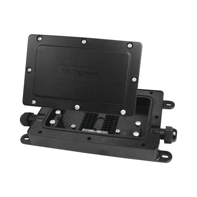 Adminte un total de 12 empalmes por fusión y 2 empalmes mecánicos que se colocan de forma segura dentro del cierre con protección al ingreso IP68. El DFE100 se puede enterrar permanentemente o montarse en el lateral de un edificio.