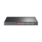 Switch 24-Puertos 10/100Mbps + 2-Port Gigabit PoE+ No Gestionable 24× puertos PoE+ 10/100 Mbps RJ45, 2× puertos Gigabit RJ45, y 2× slots combo Gigabit SFP Alta potencia PoE hasta 30...